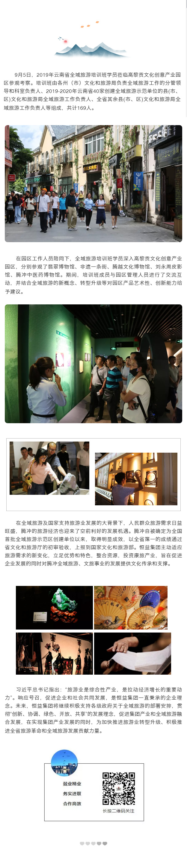 2019年云南省全域旅游培訓(xùn)班學(xué)員參觀高黎貢文化創(chuàng)意產(chǎn)業(yè)園區(qū) 來源: 瀏覽量:8180 日期:2019-09-06 分享到: 上一篇:恒益集團組織召開2020年全面預(yù)算編制啟動及培訓(xùn)會 下一篇:恒益集團組織開展資金集中管理培訓(xùn)