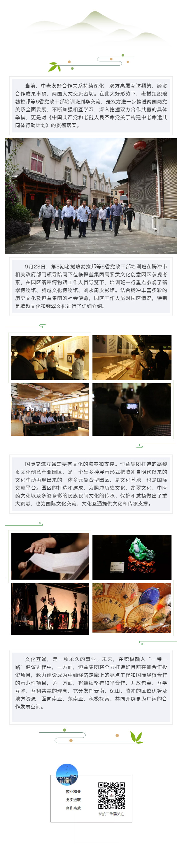 第3期老撾瑯勃拉邦等6省黨政干部培訓班蒞臨高黎貢文化創(chuàng)意園區(qū)參觀考察 來源: 瀏覽量:8281 日期:2019-09-24 分享到: 上一篇:騰沖市副市長李屏一行蒞臨恒益健康體檢中心調研指導 下一篇:商務部紀檢監(jiān)察穩(wěn)外貿(mào)調研組蒞臨恒益集團調研