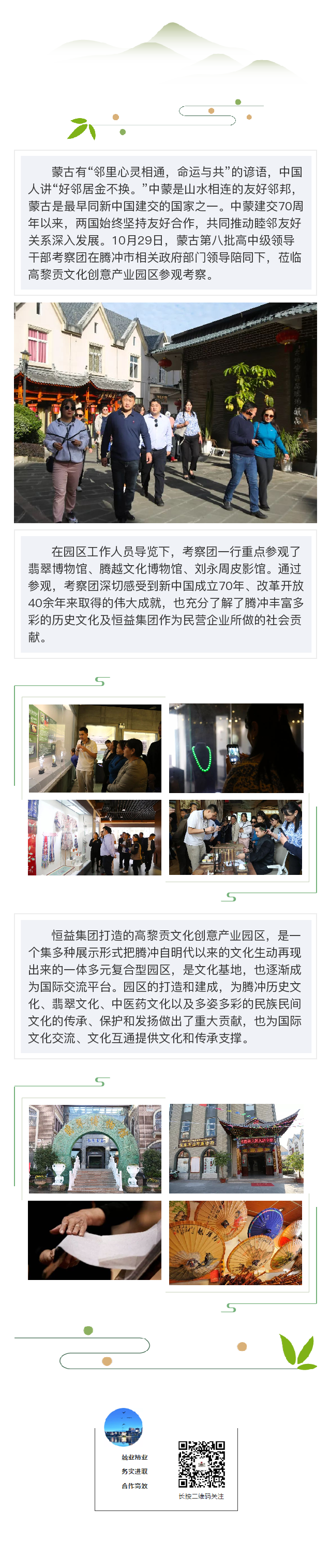 蒙古第八批高中級領(lǐng)導干部考察團蒞臨高黎貢文化創(chuàng)意產(chǎn)業(yè)園區(qū)參觀考察 來源: 瀏覽量:7906 日期:2019-10-29 分享到: 上一篇:國家發(fā)改委價格認證中心第四期培訓會成員參觀考察騰沖翡翠博物館 下一篇:恒益集團第三屆籃球賽揭開戰(zhàn)幕