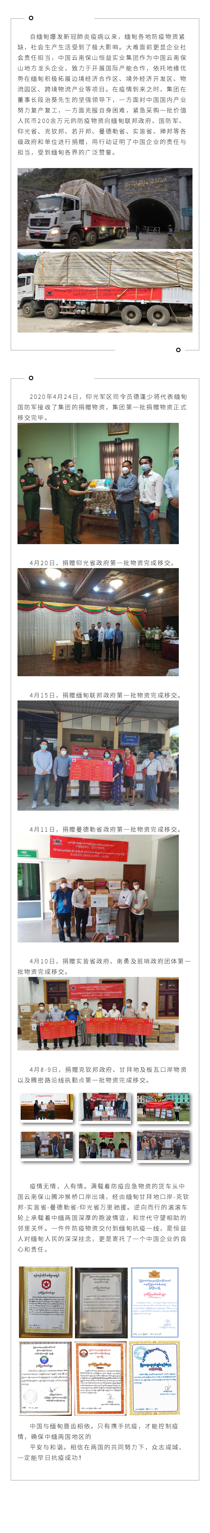情深 守望相助——中國云南保山恒益實業(yè)集團為支援緬甸抗擊新冠肺炎疫情捐贈防疫物資 來源: 瀏覽量:7999 日期:2020-04-26 分享到: 上一篇:騰沖市恒益礦產(chǎn)品經(jīng)貿(mào)有限責(zé)任公司哨坡選廠脫水干堆、廢水循環(huán)利用技術(shù)改造項目 環(huán)境影響報告書 公眾參與第一次信息公示 下一篇:騰沖市恒益礦產(chǎn)品經(jīng)貿(mào)有限責(zé)任公司新建滇灘鐵礦大火山排土場項目(基建期) 水土保持設(shè)施驗收公示