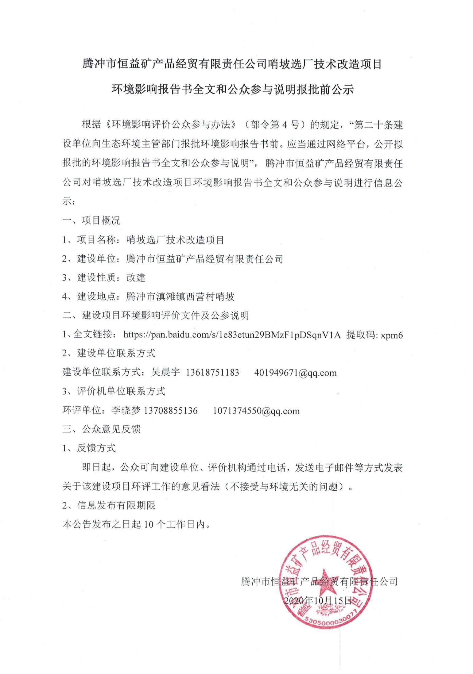 騰沖市恒益礦產(chǎn)品經(jīng)貿(mào)有限責(zé)任公司哨坡選廠技術(shù)改造項(xiàng)目環(huán)境影響報(bào)告書(shū)全文和公眾參與說(shuō)明報(bào)批前公示