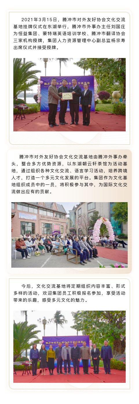 恒益集團掛牌“騰沖市對外友好協(xié)會文化交流基地” 來源: 瀏覽量:6983 日期:2021-03-16 分享到: 上一篇:爛刺溝尾礦庫驗收公示內(nèi)容 下一篇:“東山之下,原創(chuàng)詩歌、散文分享會”在東山書院隆重舉行