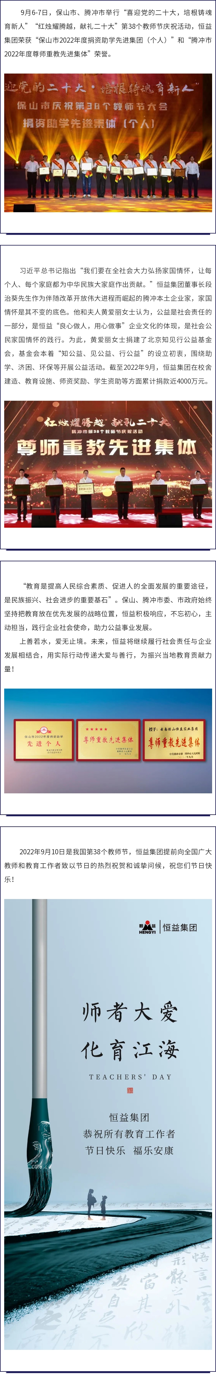 喜訊│恒益集團(tuán)榮獲捐資助學(xué)、尊師重教先進(jìn)集體(個(gè)人) 來源: 瀏覽量:5486 日期:2022-09-09 分享到: 上一篇:恒益集團(tuán)組織開展新聞寫作專題培訓(xùn) 下一篇:知見行公益基金會(huì)聯(lián)合恒益集團(tuán)向騰沖市八所學(xué)校捐贈(zèng)230萬元獎(jiǎng)教金