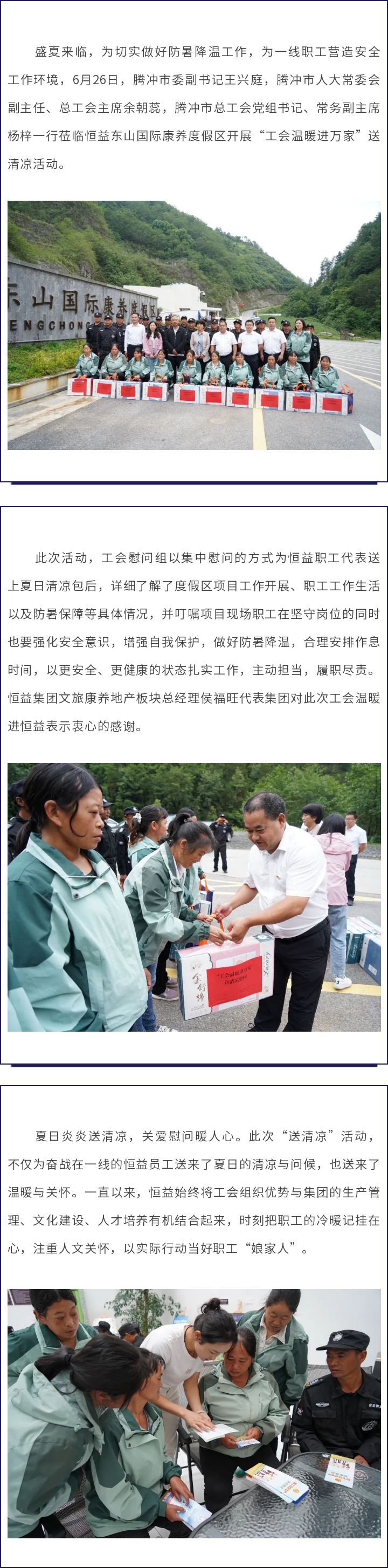 工會溫暖進萬家 清涼慰問至恒益 來源: 瀏覽量:4672 日期:2023-06-27 分享到: 上一篇:領航定向 聚力篤行丨恒益集團組織召開第二屆董事會第七次會議暨2023年半年度經濟運行分析會議 下一篇:騰沖玉文化論壇成功舉辦 跟著故宮博物院文博專家解碼清代宮廷玉器