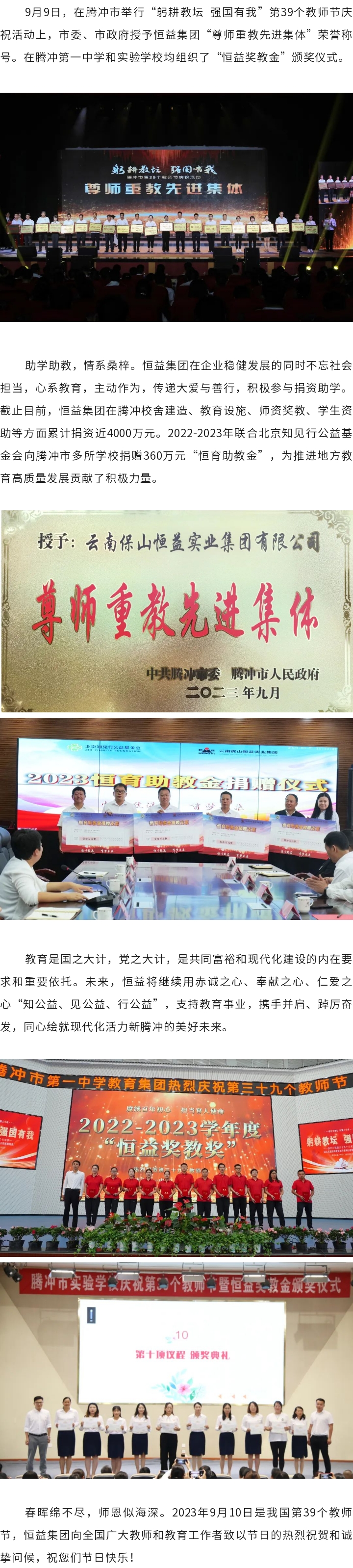 喜訊│恒益集團(tuán)榮獲“尊師重教先進(jìn)集體”稱號 來源: 瀏覽量:4280 日期:2023-09-12 分享到: 上一篇:喜訊丨恒益集團(tuán)連續(xù)3年蟬聯(lián)云南省非公企業(yè)百強(qiáng)榜前50位 下一篇:恒益集團(tuán)組織開展輪崗項(xiàng)目“活水計(jì)劃1.0”
