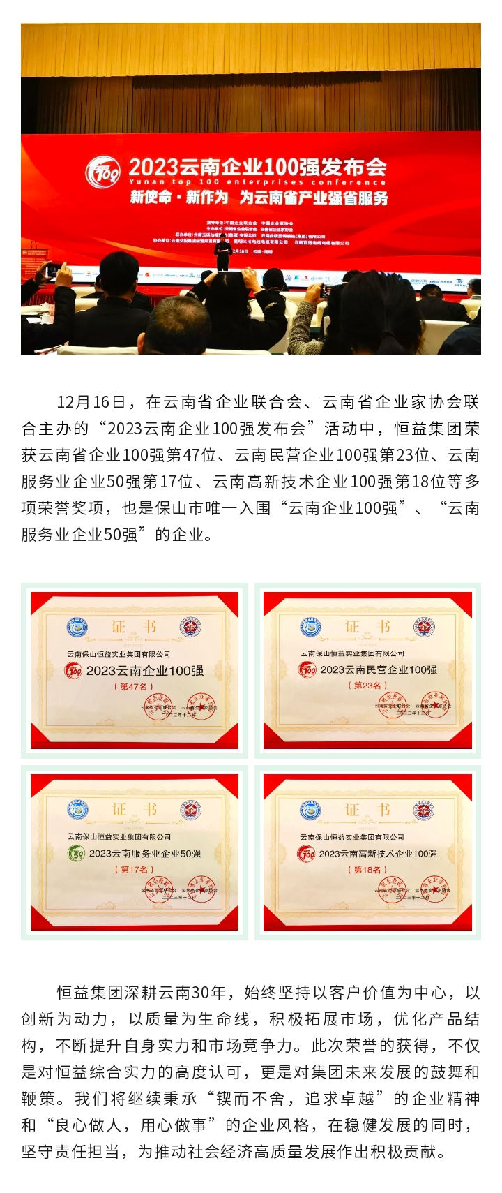 喜訊丨恒益集團(tuán)獲得“2023云南企業(yè)100強(qiáng)”等多項榮譽(yù)獎項 來源: 瀏覽量:4721 日期:2023-12-16 分享到: 上一篇:考察聯(lián)誼謀發(fā)展,合作共贏譜新篇 下一篇:騰沖市恒益礦產(chǎn)品經(jīng)貿(mào)有限責(zé)任公司滇灘鐵礦東排土場建設(shè)項目環(huán)境影響評價公眾參與第二次信息公示