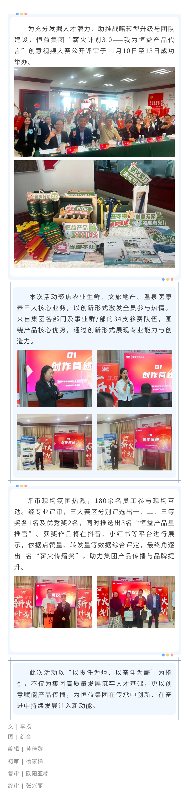 恒益集團(tuán)“薪火計劃3.0”視頻創(chuàng)意大賽公開評審圓滿落幕 以創(chuàng)意賦能產(chǎn)品傳播 來源: 瀏覽量:340 日期:2025-11-16 分享到: 上一篇:恒益集團(tuán)與云南財經(jīng)大學(xué)簽約授牌 共啟文旅育才新篇章 下一篇:東西方慈善論壇聯(lián)合創(chuàng)始人一行到訪恒益集團(tuán) 共探公益合作新路徑