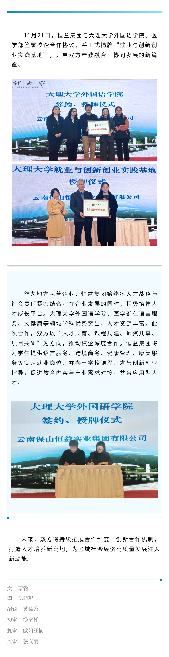 恒益集團與大理大學共建實踐基地 開啟產(chǎn)教融合新篇章 來源: 瀏覽量:235 日期:2025-11-21 分享到: 上一篇:邀請函 | 2025騰沖科學家論壇·旅居與醫(yī)康養(yǎng)創(chuàng)新發(fā)展論壇即將盛大啟幕 下一篇:恒益集團與云南財經(jīng)大學簽約授牌 共啟文旅育才新篇章